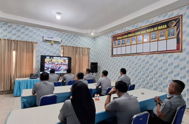 SUMSELONLINECOM,- Kalapas Muara Enim dan Jajaran hadiri Penyambutan Menteri Koordinator Hukum dan HAM, Menteri Hukum, Menteri Hak Asasi Manusia, Menteri Imigrasi dan Pemasyarakatan secara virtual berlangsung di Ruang rapat Lapas Muara Enim Senin (21/10/24).