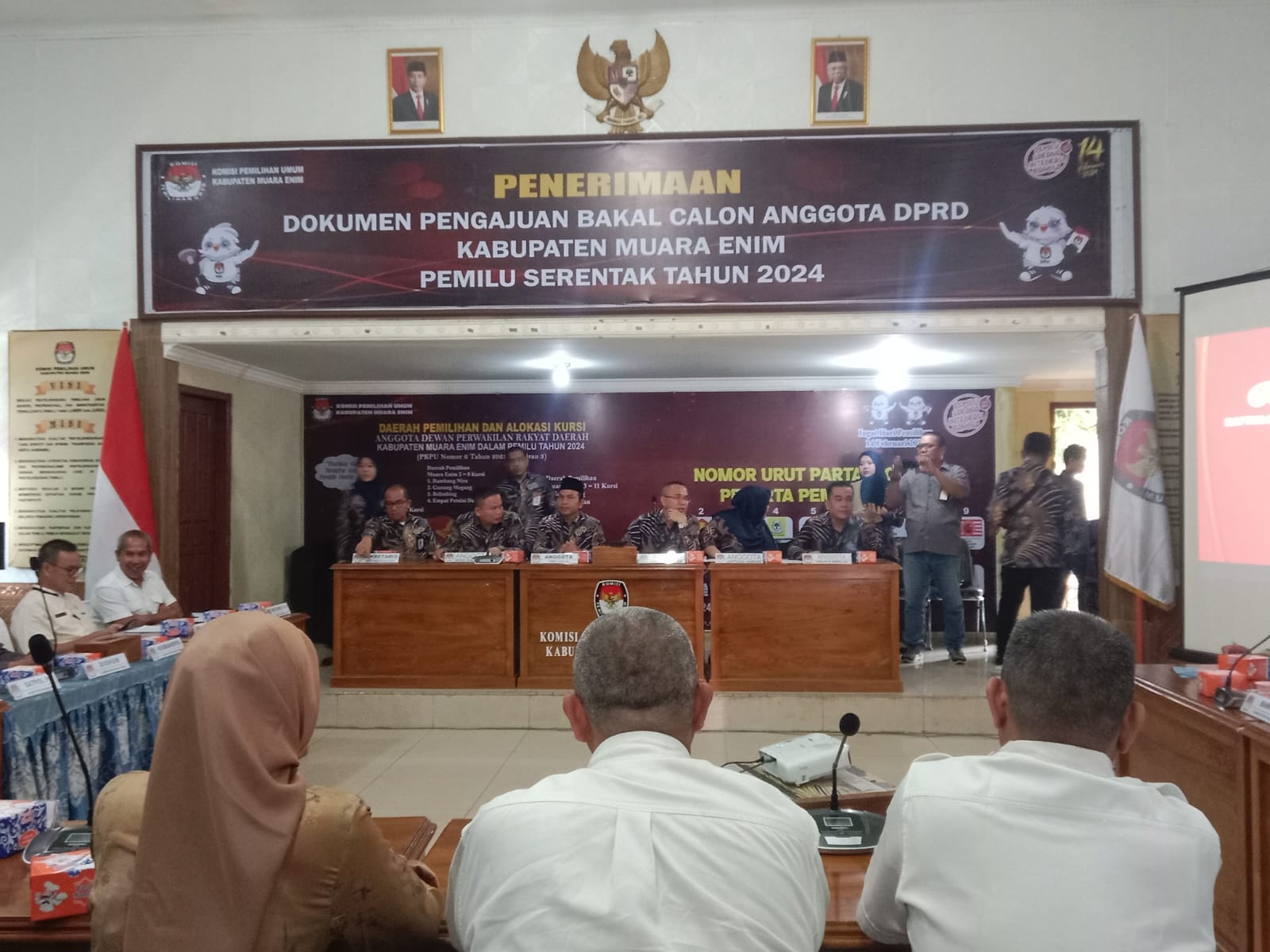 “Hari ini ada dua agenda besar dilaksanakan oleh KPU kabupaten Muara Enim yaitu penerimaan dokumen pengajuan bakal calon anggota DPRD kabupaten Muara Enim Pada Pemilu Serentak Tahun 2024 dan Rapat Pleno Rekapitulasi dan Penetapan Daftar Pemilih Sementara Hasil Perbaikan (DPSHP) Tingkat Kabupaten Muara Enim,”ungkap Ahyaudin didampingi keempat Komisioner lainnya.