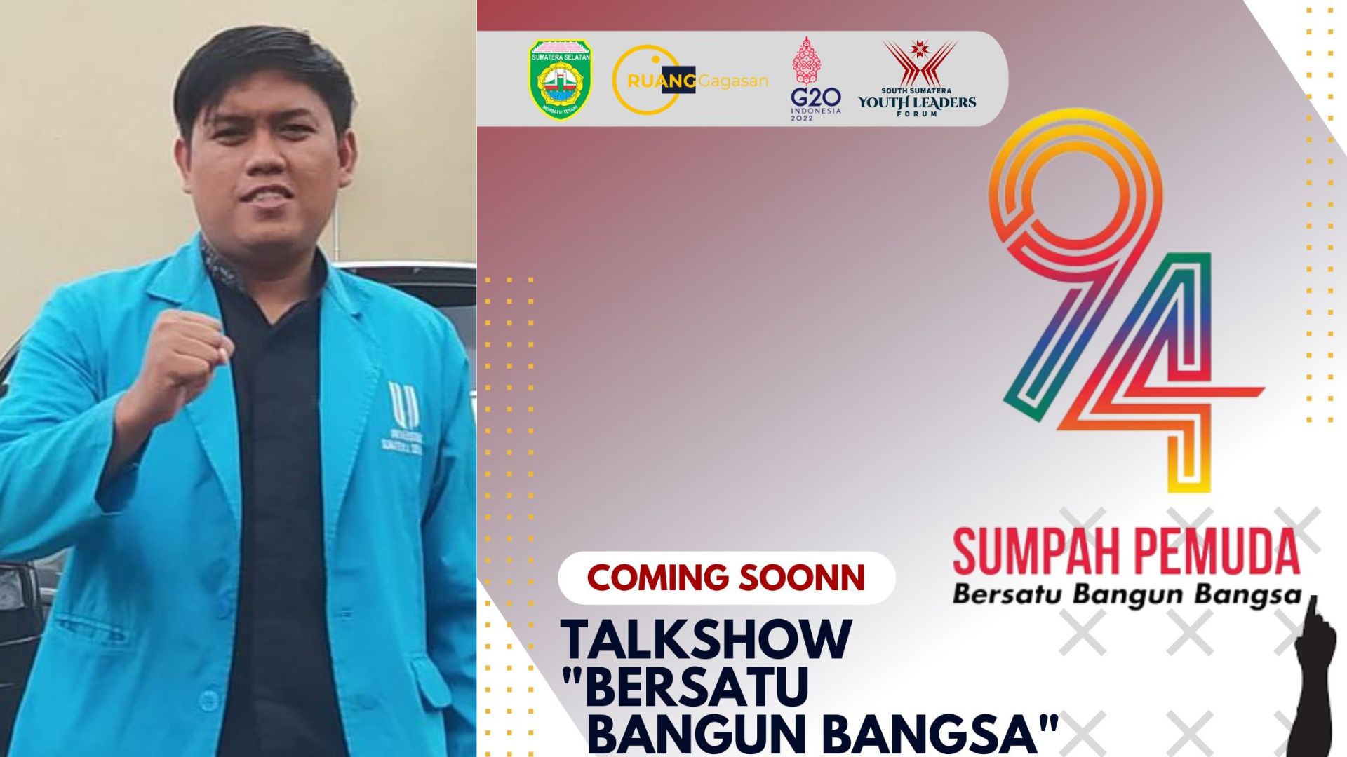 SUMSELONLINE.COM – Ruang Gagasan akan kembali hadir melaksanakan kegiatan Talkshow Menyambut Hari Sumpah Pemuda yang ke-94 tahun. Kegiatan ini bisa mengajak dan mengingatkan para pemuda dan mahasiswa, yang mana Pemuda sebagai tonggak dari peradaban bangsa, pemuda sebagai aset sebuah bangsa, pemuda sebagai kalangan yang menentukan arah kemajuan bangsa, serta dengan dilaksanakan kegiatan ini diharapkan menambah wawasan.