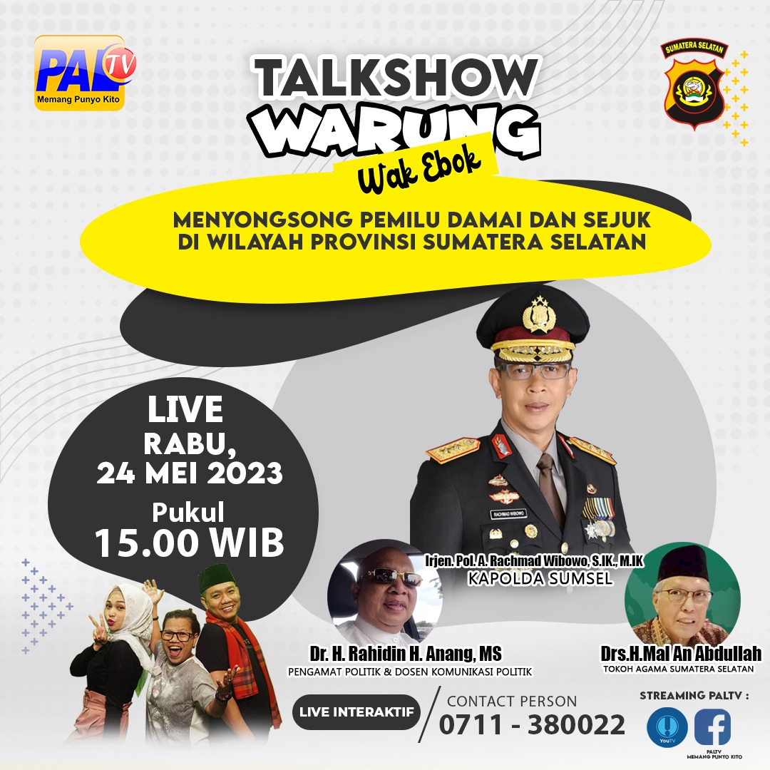 SUMSELONLINE.COM – Live Pada Rabu 24 Mei 2023 Pukul 15:00 WIB, Stasiun Televisi PAL TV rencananya akan menyelenggarakan Talk Show yang dikemas dalam acara Talk Show Warung Wak Ebok dalam rangka Menyongsong Pemilu Damai dan Sejuk diwilayah Provinsi Sumatera Selatan.
